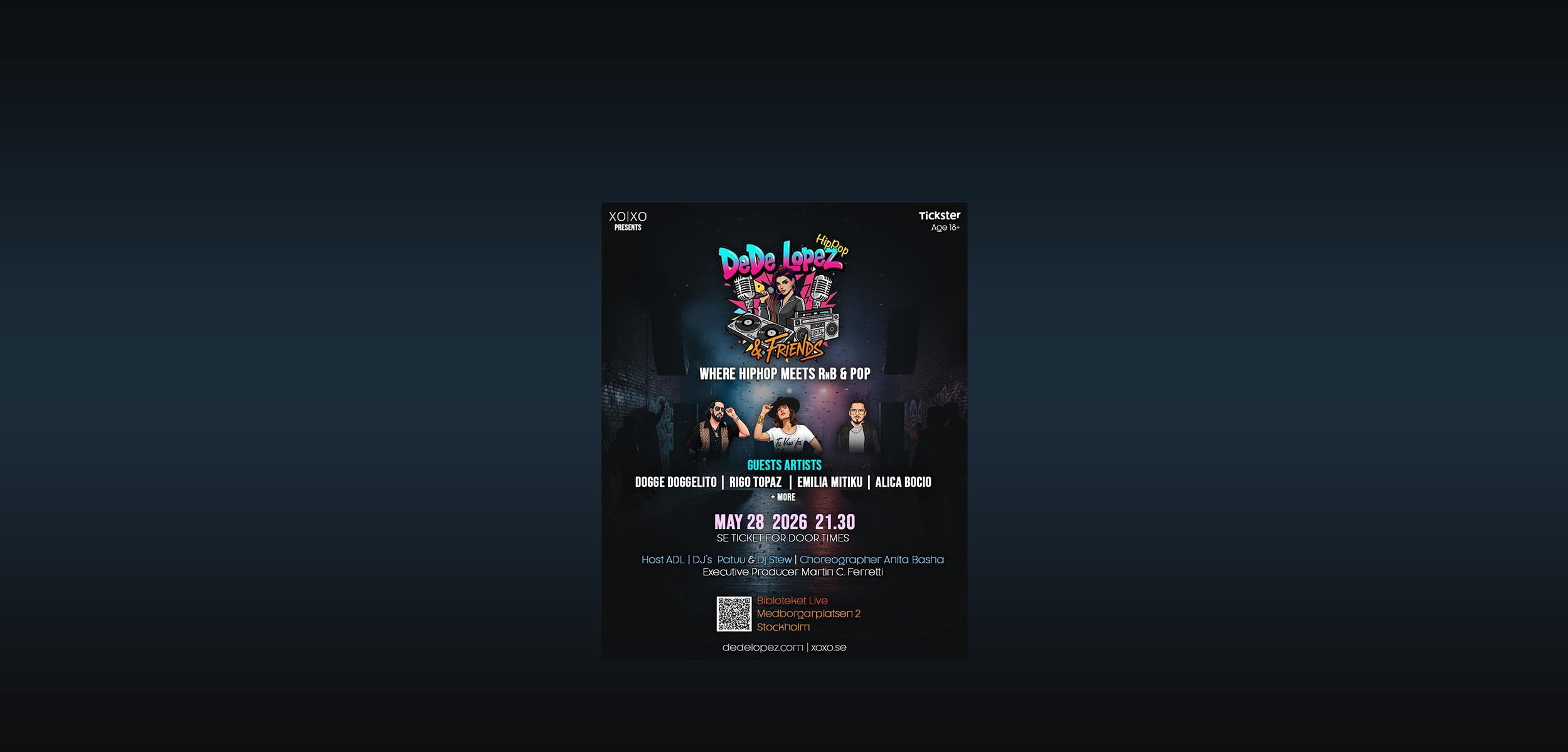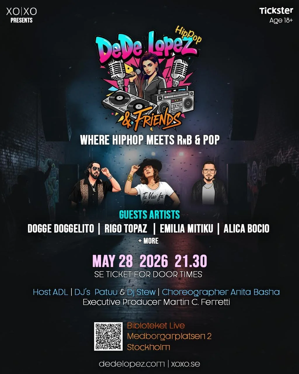 Kvällen bjuder på en unik kombination av liveframträdanden, DJ-set och koreografi. På scen får DeDe sällskap av nära vänner och legendariska gästartister som Dogge Doggelito, Rigo Topaz, Emilia Mitiku och Alicia Bocio. Kvällens värd (Host) är ingen mindre än ADL.